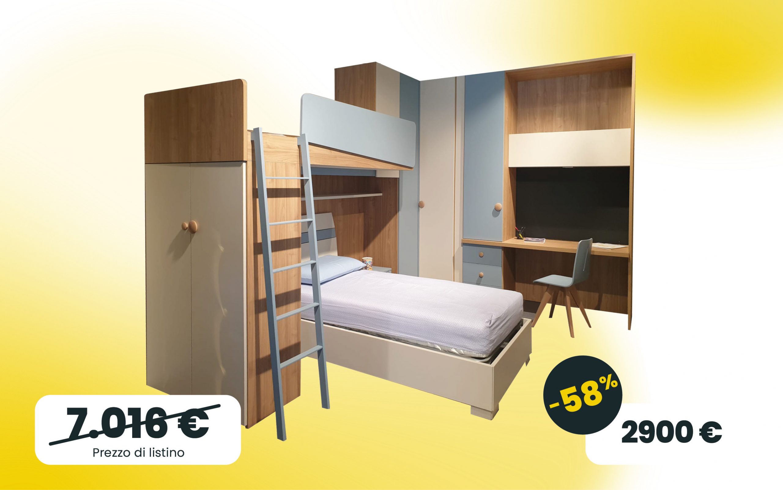 Cameretta a soppalco con due letti, armadio e scrivania